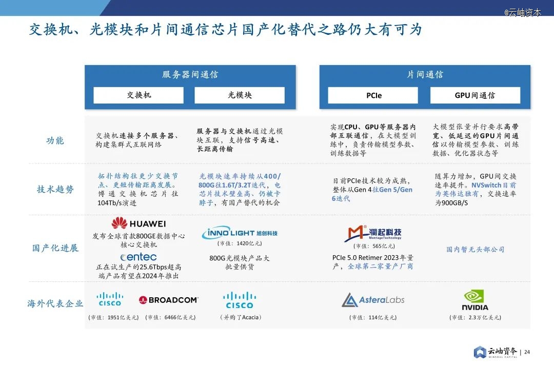 网络互联主要包括服务器间通信互联和片间通信互联,交换机、光模块、PCIe Retimer、NVSwitch等都属于数据中心中网络互联器件,目前都在往更高数据传输速率方向演进。国外以英伟达、博通、Astera Labs等为代表的网络互联厂商都显著受益于AI发展的浪潮,国产中高端网络互联芯片仍较为稀缺,有待更多国产芯片供应商突破封锁垄断。
