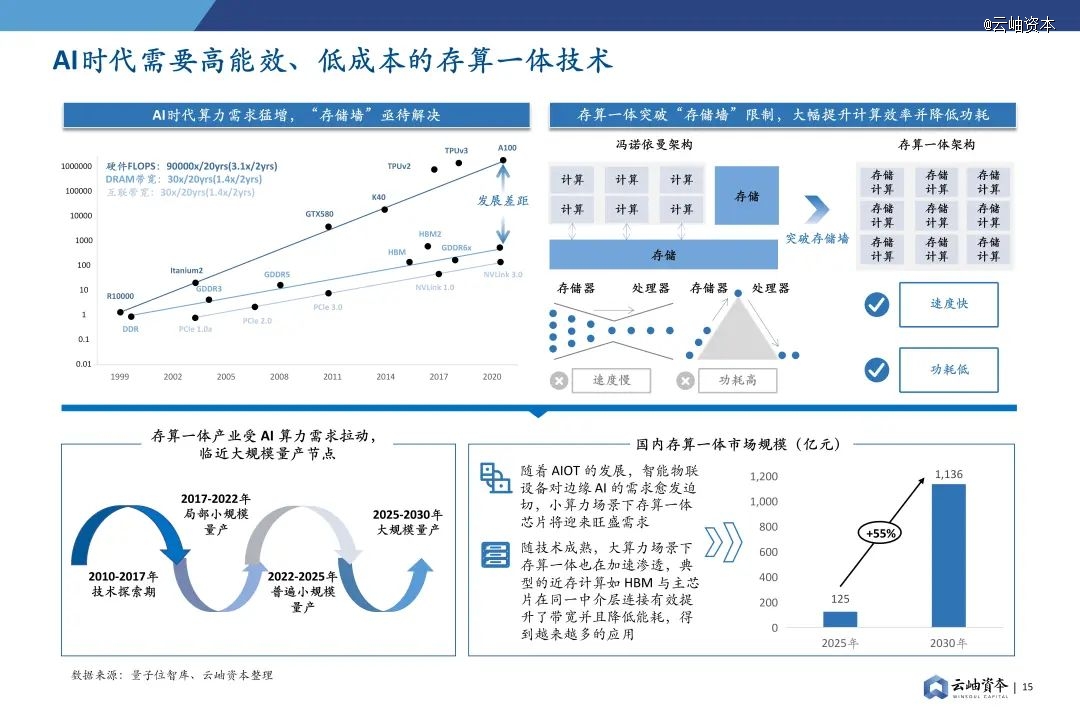当前计算能力与数据搬运之间的鸿沟以每年50%的速率扩大,大模型时代数据访存在整个计算周期里的占比达95%以上,“存储墙”问题亟待解决。存算一体是AI时代数据搬运最根本的解决方案,能大幅提升计算效率并降低功耗。受到AI旺盛需求拉动,存算一体将迎来商业化转折点,小算力和大算力场景先后爆发,预计2025/2030年基于存算一体技术的芯片市场规模将分别达到125/1,136亿元。