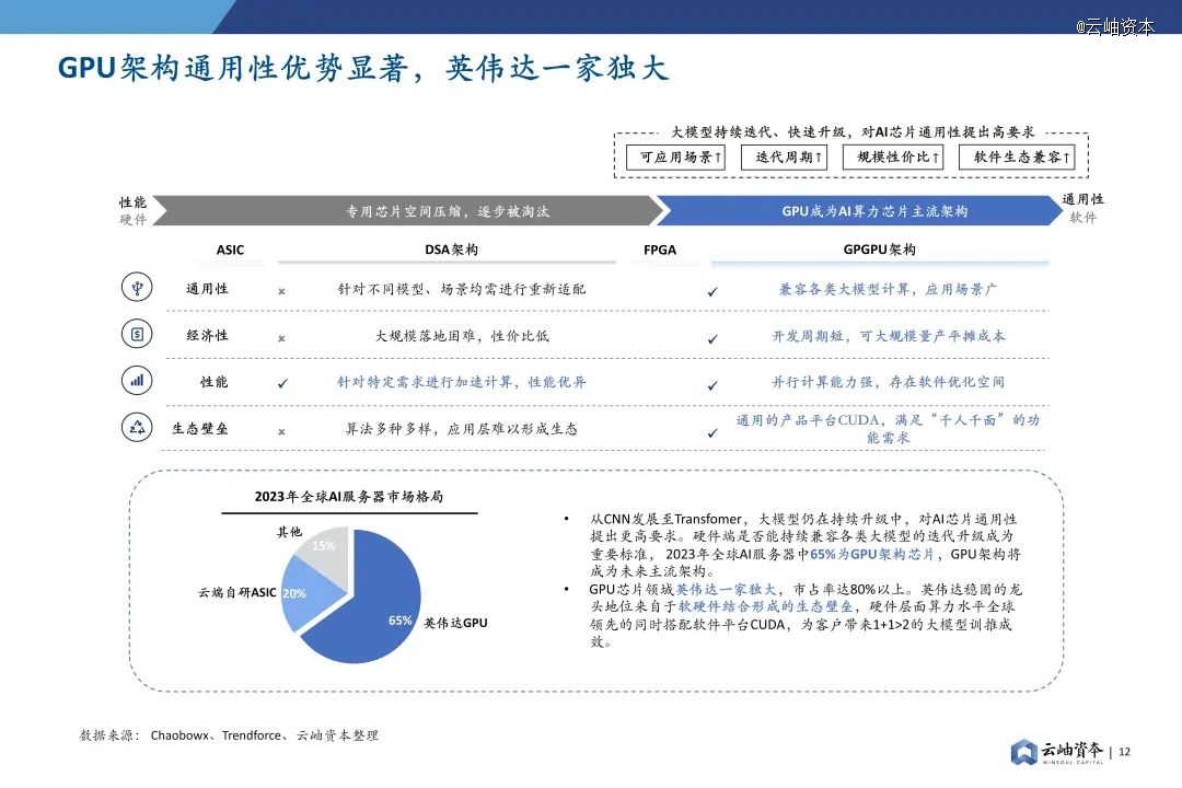 相较性能更为优异的DSA架构,GPU架构在通用性上的突出优势使其能快速兼容各类模型、场景,通过大规模落地量产平摊研发成本。此外,GPU架构于性能端也存在软件优化空间,CUDA平台已形成软件生态壁垒,助力AI各类场景应用硬件加速。2023年英伟达在全球AI服务器市场占有率达到65%,保持*的龙头地位。