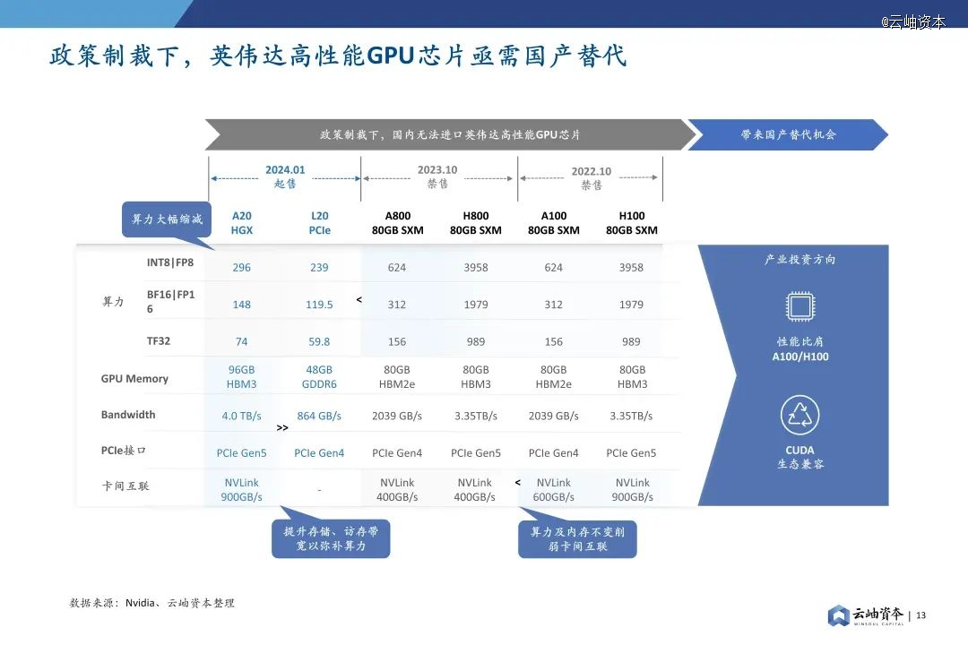 2022年10月,美国商务部工业与安全局(BIS)公布了《对向中国出口的先进计算和半导体制造物项实施新的出口管制》,禁售了英伟达的高性能H100、A100芯片。为了应对政策制裁,英伟达推出了中国*版H800、A800芯片,在单卡算力不变的基础上削弱了卡间互联能力,阻碍多机多卡算力集群的构建。2023年10月美国商务部宣布禁令升级,*版H800、A800芯片成为历史,英伟达只好再次推出性能更低的A20、L20芯片,算力遭到大幅削减。在英伟达高性能芯片获取困难的背景下,国内高性能GPU芯片预计将长期处于供不应求阶段,因此我们认为国产GPU应首先解决有无问题,国产替代的投资机会预计将集中于硬件性能接近A100/H100,软件兼容CUDA生态的GPU芯片创业公司。