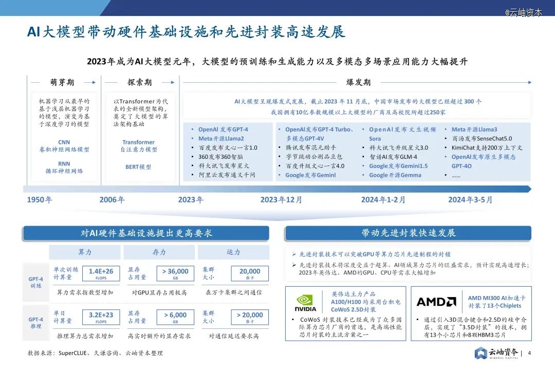 AI大模型在2023年飞速发展,截止2023年底国内大模型已经超过300个,拥有10亿参数规模以上大模型的厂商及高校院所超过250家,AI大模型已成为推动国内半导体行业成长的重要动力。与此同时,大模型参数量及训练数据量的指数级增长对算力、存力和运力提出更高要求,先进封装作为后摩尔时代提升芯片性能的重要手段,受益于AI大模型迎来发展机遇,需求大幅增加,产能持续紧张。