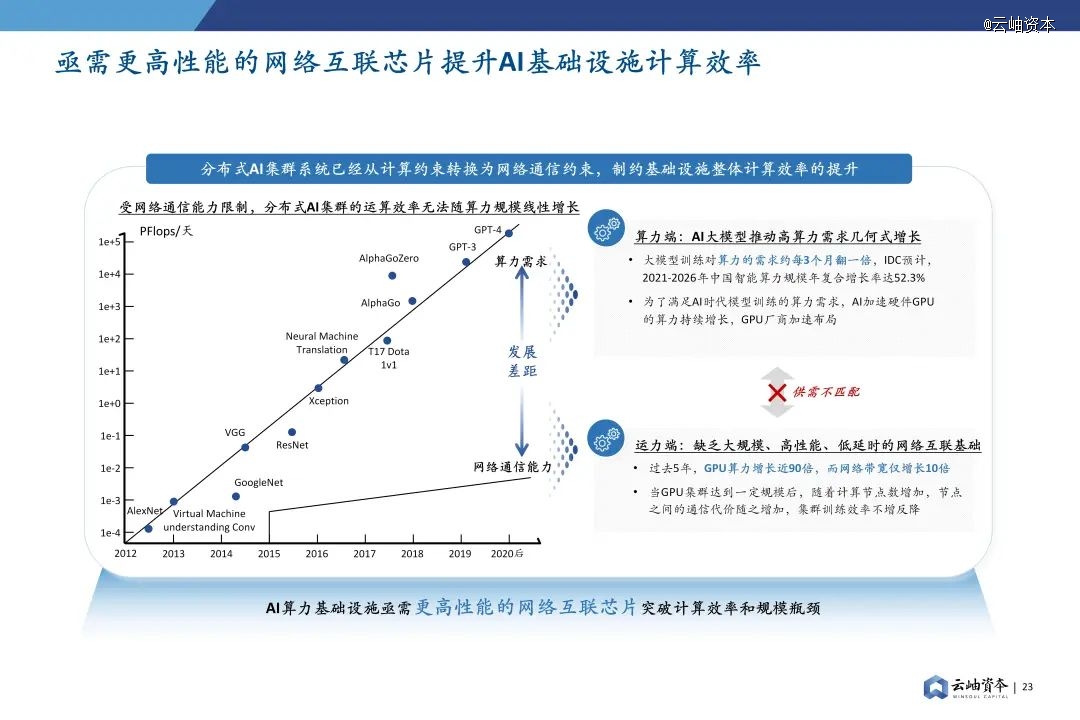 AI大模型的持续快速迭代推动分布式AI集群算力几何式增长,目前大模型训练对算力的需求约每3个月翻1倍。但同时网络通信能力的增长显著滞后于算力,网络通信能力成为制约分布式AI集群的整体计算效率重要因素,大模型时代的AI基础设施亟需更高性能的网络互联芯片。