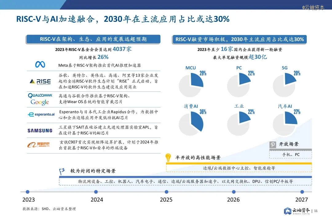 2023年RISC-V在架构、生态、应用的发展远超预期。根据SHD的数据显示,RISC-V基金会在2023年底已有会员4037家,各大巨头包括Meta、谷歌、英特尔、高通、阿里、三星等纷纷投身其中,并将更多的注意力放在了RISC-V与AI的深度融合上。2023年至少有16家研发RISC-V芯片的国内创企获得新一轮融资,2023年RISC-V北美峰会预测在2030年RISC-V将占领各主流市场近30%的份额。