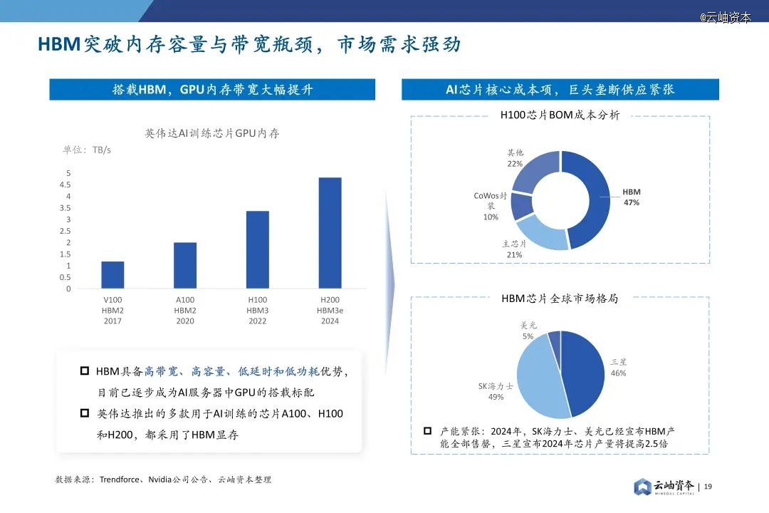 HBM通过将DRAM芯片层叠在一起,形成一个垂直的结构,具备高带宽、高容量、低延时和低功耗优势,能够突破内存容量与带宽瓶颈,目前已逐步成为AI服务器中GPU的搭载标配。英伟达推出的多款用于AI训练的芯片A100、H100和H200,都采用了HBM显存。