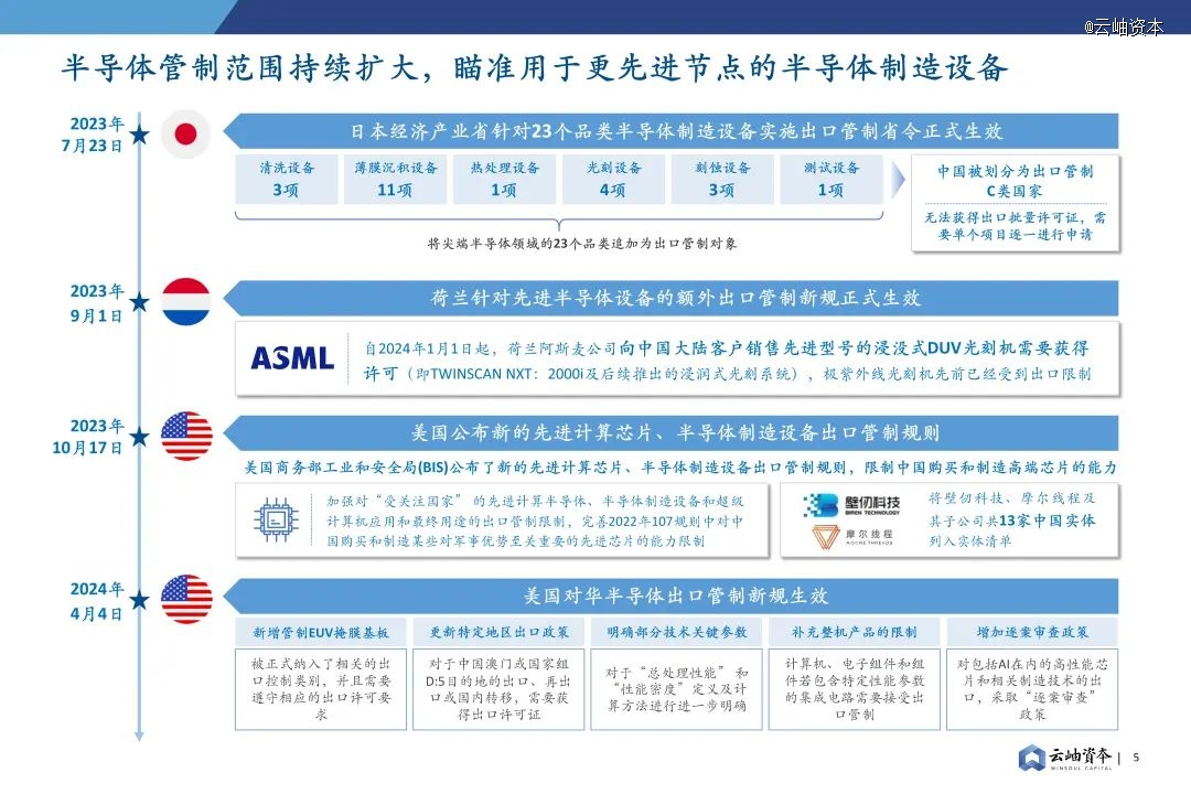 2023年美日荷联手加大对中国先进制程设备及先进计算芯片的出口管制,试图阻止中国先进制程芯片的崛起。7月,日本针对23个品类半导体制造设备实施出口管制省令正式生效,涉及清洗、薄膜沉积、热处理、光刻、刻蚀、测试设备;9月,荷兰政府宣布自2024年1月起,阿斯麦向中国大陆客户销售先进型号的浸没式DUV需获得许可;10月,美国商务部工业安全局发布新的先进计算芯片、半导体制造设备出口管制规则,并将壁仞科技、摩尔线程列入实体清单;2024年4月,美国对华半导体出口管制新规生效,新增管制EUV掩膜基板、更新中国澳门等特地地区出口政策、明确技术关键参数、补充整机产品限制并增加逐案审查政策。