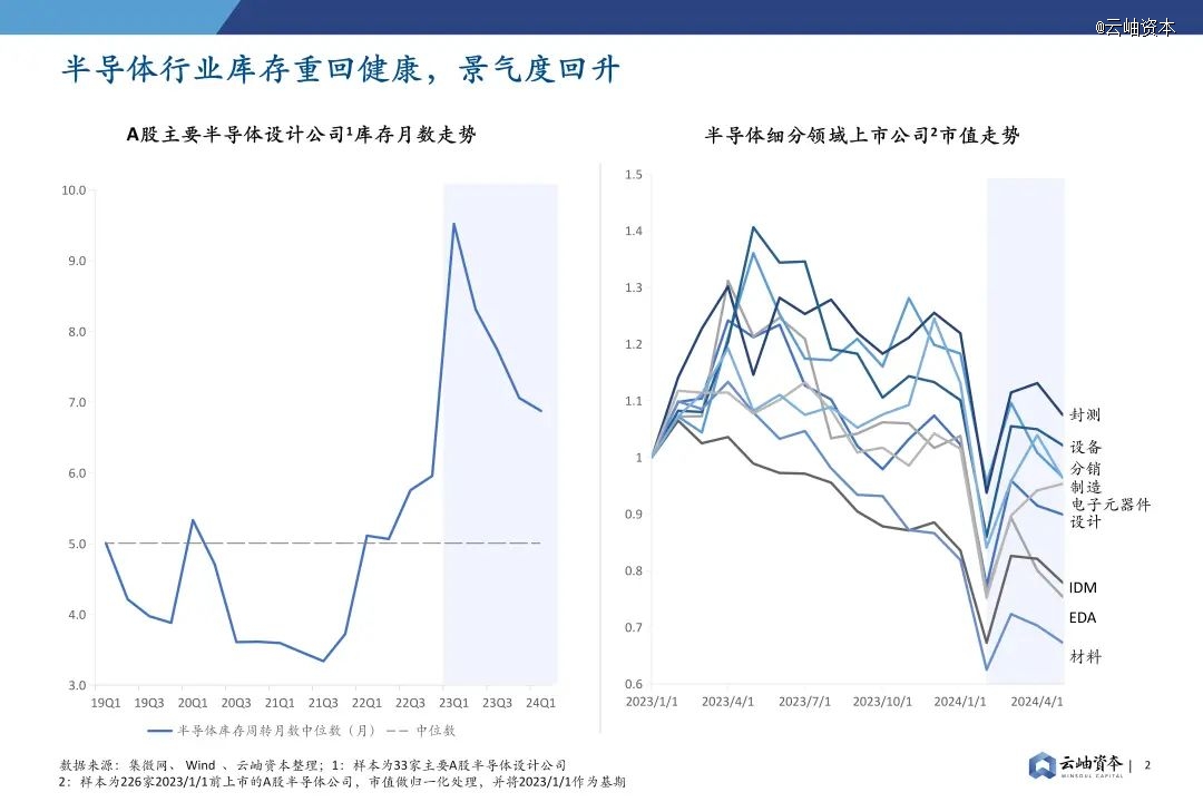 2023年全球经济减速、终端消费疲软,“去库存”成为半导体产业2023年至今的主旋律。A股33家有代表性的半导体设计公司的库存中位数从2023年Q1的9.5个月峰值回落到2024年Q1的6.7个月,库存逐步回归合理水平。2023年半导体上市公司市值持续波动,2024年Q1伴随AI等新应用落地和下游需求缓慢复苏,半导体市值逐步回归,半导体行业走出低谷,正式步入周期上行通道。