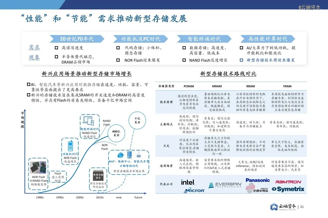 进入高性能计算时代,新兴应用场景推动新型存储市场增长,AI、智能汽车等新兴应用对数据存储在速度、功耗、容量、可靠性等层面提出了更高要求。新兴的存储技术旨在集成SRAM的开关速度和DRAM的高密度特性,并具有Flash的非易失特性,具备千亿市场空间。在ReRAM等新型存储器的发展上,中国与其他国家站在同一起跑线,有机会出现下一个三星和海力士。