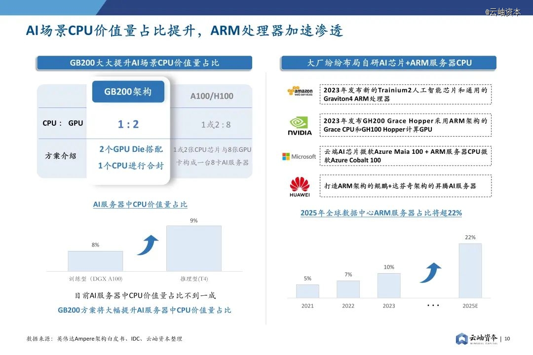 2024年3月英伟达发布GB200,该芯片由2个B200和1个Grace CPU合封而成,大大提升AI场景CPU价值量占比。ARM架构服务器CPU得益于低功耗的特点,近年来越来越受到全球各大云服务厂商青睐,亚马逊、英伟达、微软、华为等大厂纷纷布局自研AI芯片+ARM服务器CPU方案,预计2025年ARM CPU在数据中心占比将提升至22%。
