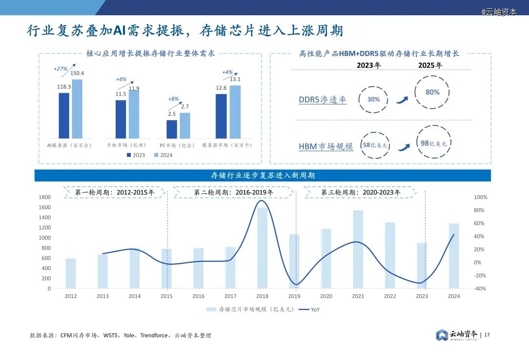 在AI服务器市场,随着AI应用的快速发展,对高容量和高速存储的需求急剧增加,推动更高性能的DDR5市场渗透率进一步提升,预计2025年达到80%,HBM市场有望从58亿美元增长至近百亿美元,高性能产品驱动存储行业未来增长。