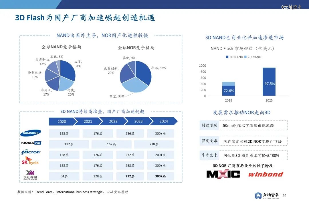 3D NAND 持续高堆叠,各大晶圆厂继续向300层更高堆叠产品推进,长江存储等国产厂商加速赶超。在3D NAND实现商业化并加速渗透背景下,NOR也在制程限制、密度要求以及降本需求等因素推动下走向3D,但仍处于起步阶段,存在国产方案的发展机遇。