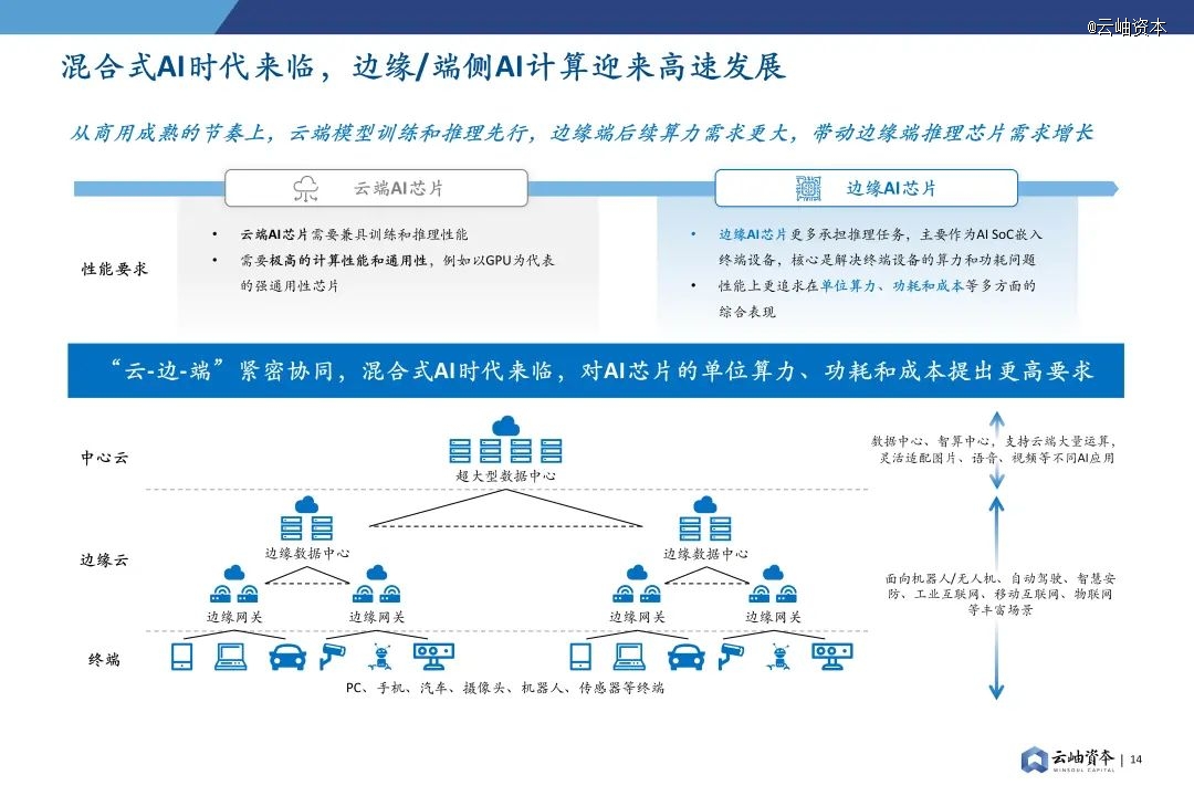 AI实时、局部数据处理和推理任务主要在边缘侧,边缘AI芯片的优势在于保护数据安全、在网络连接差的场合仍然可用、降低功耗、低延迟数据传输、低成本部署等。混合式AI时代要求“云-边-端”紧密协同,从商用成熟的节奏上,云端模型训练和推理先行,然后是边缘端的算力升级,但是边缘端最终算力需求更大,带动边缘AI芯片需求增长,并对其单位算力、功耗和成本提出更高要求。