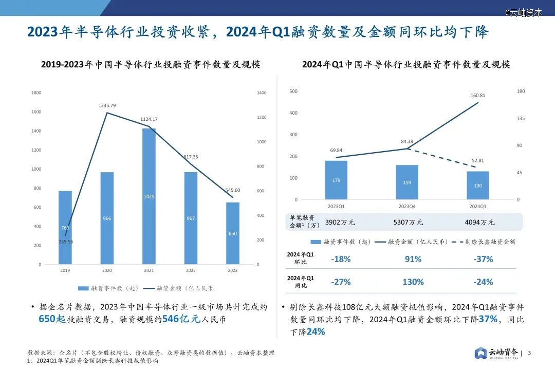 2023年半导体行业投资进一步收紧,据企名片数据,2023年半导体行业完成约650起投融资交易,融资规模约545.6亿元人民币。2024年Q1融资数量及金额同环比均下降,剔除长鑫科技108亿元大额融资极值影响,共计完成融资52.81亿元人民币,同比下降24%。