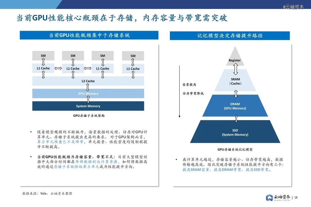 当前GPU性能瓶颈为存储容量、带宽不足。大型模型训推中大部分时间都在等待数据到达计算资源,如何将数据高效的通过存储子系统供给算力单元成为性能提升方向。离计算单元越近,存储容量越小、访存带宽越高,数据传输越高效,目前突破存储子系统性能提升方向有三个:提高SRAM容量、提高DRAM带宽、提高SSD带宽。